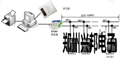 采用485通訊方式,如圖:485通訊須要自助轉(zhuǎn)賬機(jī)與電腦之間連線、距離不能超過1200米,自助轉(zhuǎn)賬機(jī)可以設(shè)在充值點(diǎn)旁邊,或食堂內(nèi)。