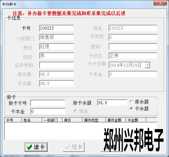 注: 收繳舊卡是卡片不再使用將卡片收回的操作,進行讀卡,卡庫一致的情況下就可進行寫卡,退還卡余額完成操作。收繳回來的卡可以重新發行。