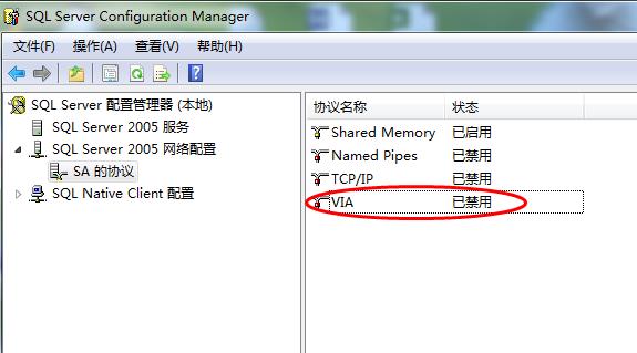 4、打開SQL Server 2005中的配置工具SQL Server Configure Manager,將VIA協議禁用