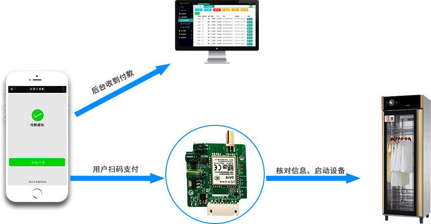 共享干衣機采用無人經營模式,用戶使用掃碼支付使用,運營商則借助云管理平臺實現遠程管理。